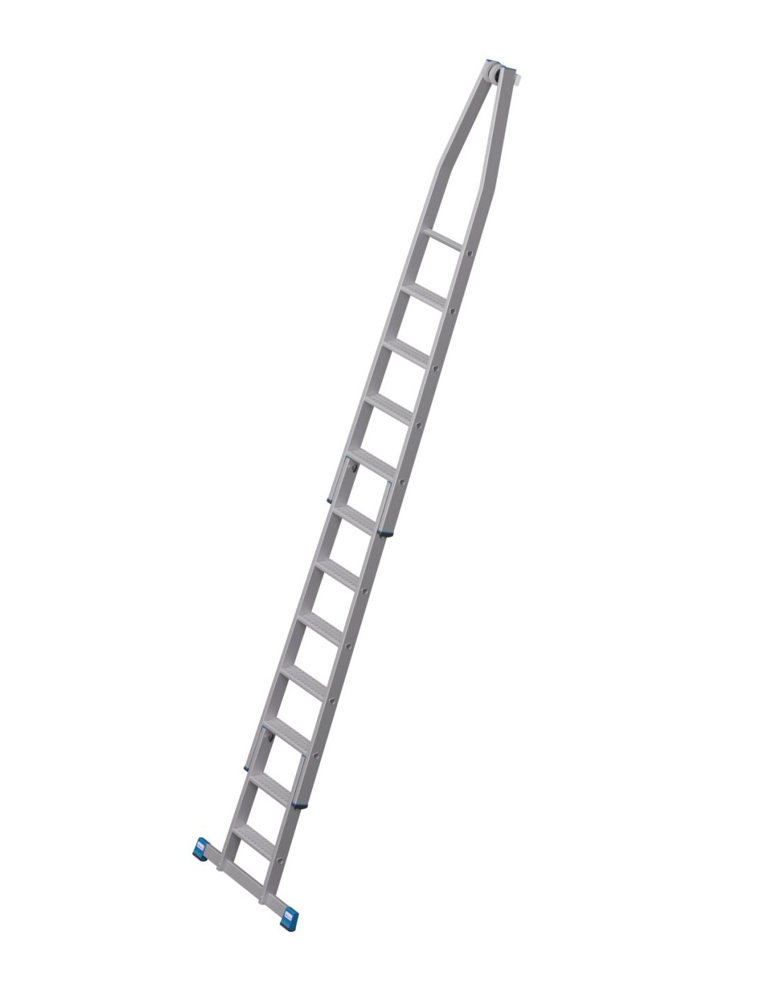 A létra felső tagja fali vezetőgörgőkkel és kopásálló, puha gumi anyagú érintkező blokkal, ékkivágással, mely házsarkakra és ablakprofilokra helyezhető