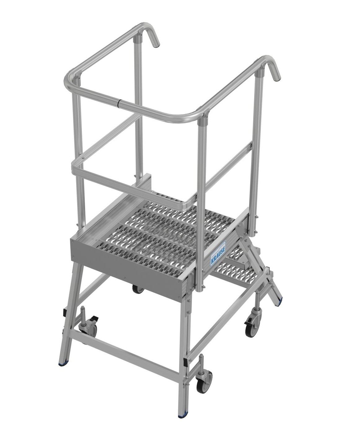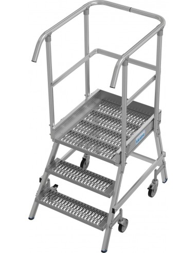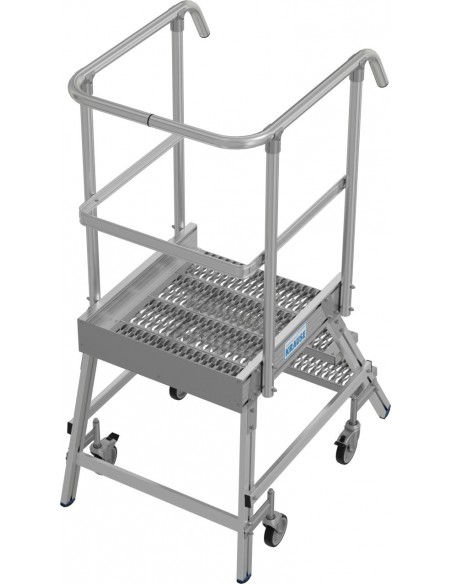 Két oldalon járható gurítható alumínium dobogó 180 mm mély lépcsőfokokkal és nagy állófelülettel R13 csúszásmentes profilrácsból, amely körbefutó dobogókorláttal van felszerelve a biztonságos és kényelmes munkavégzés érdekében