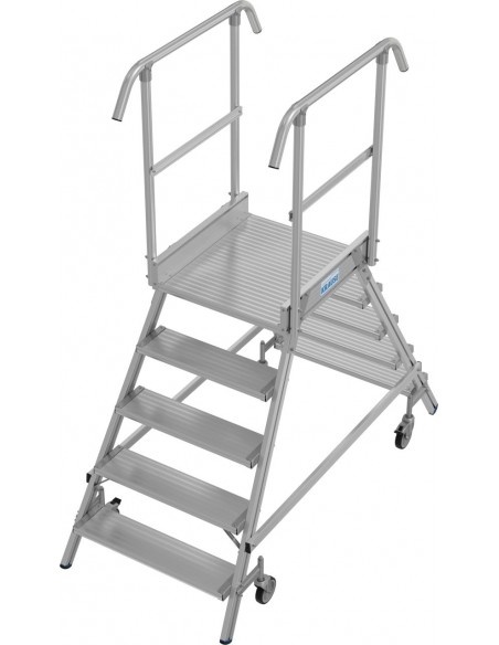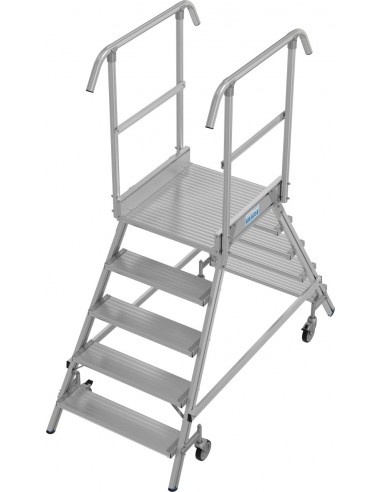 Egy oldalon járható gurítható alumínium dobogó 175 mm mély, csúszásmentes lépcsőfokokkal és nagy állófelülettel, amely körbefutó korláttal van felszerelve a biztonságos és kényelmes munkavégzés érdekében