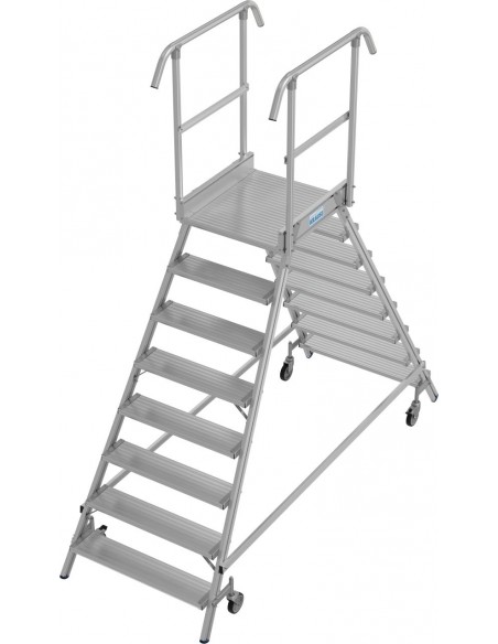 Egy oldalon járható gurítható alumínium dobogó 175 mm mély, csúszásmentes lépcsőfokokkal és nagy állófelülettel, amely körbefutó korláttal van felszerelve a biztonságos és kényelmes munkavégzés érdekében