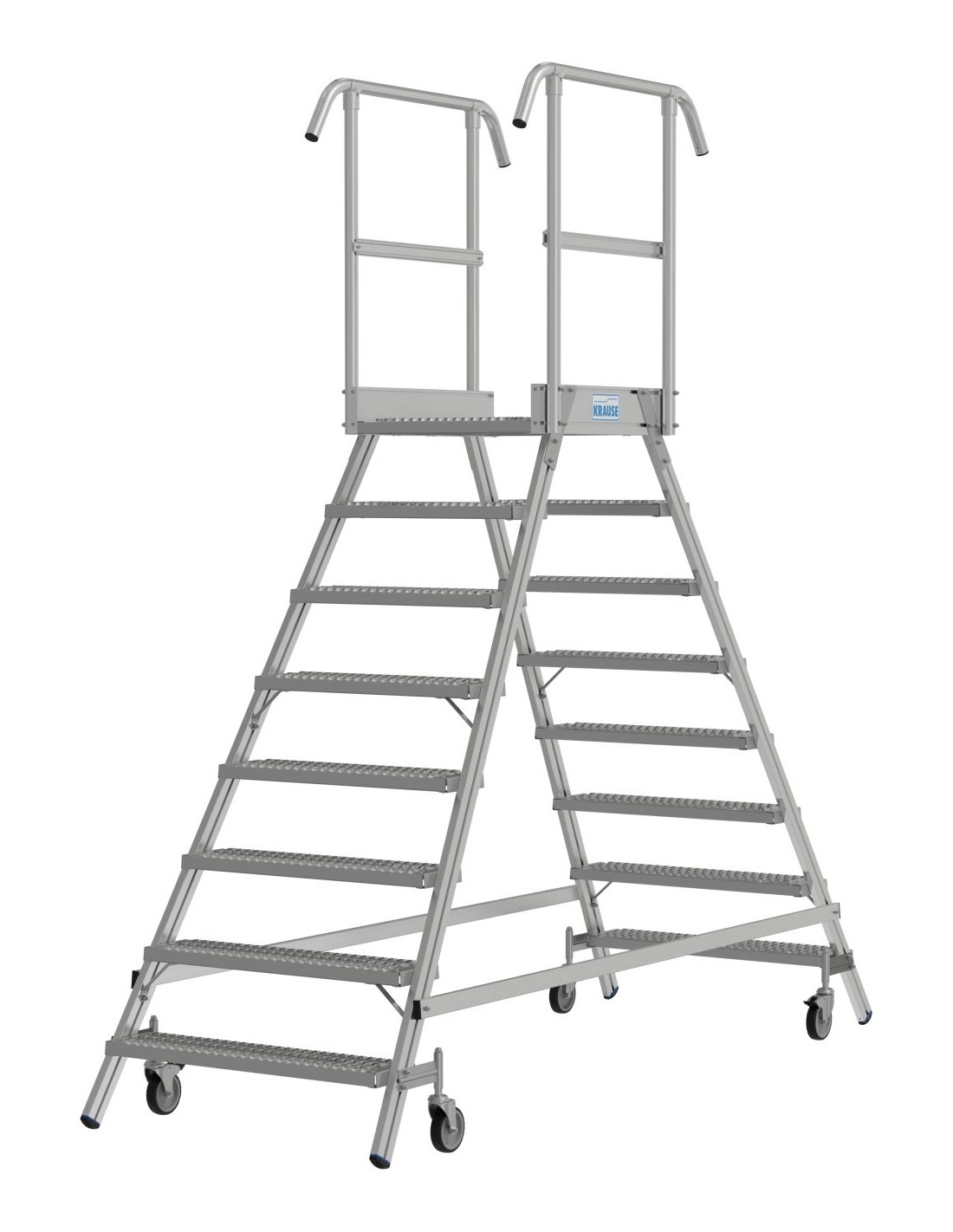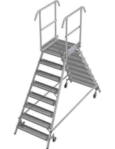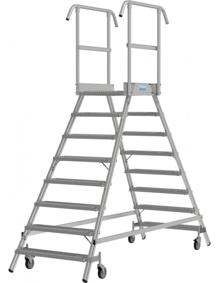 Két oldalon járható gurítható alumínium dobogó 180 mm mély lépcsőfokokkal és nagy állófelülettel R13 csúszásmentes profilrácsból, amely körbefutó dobogókorláttal van felszerelve a biztonságos és kényelmes munkavégzés érdekében