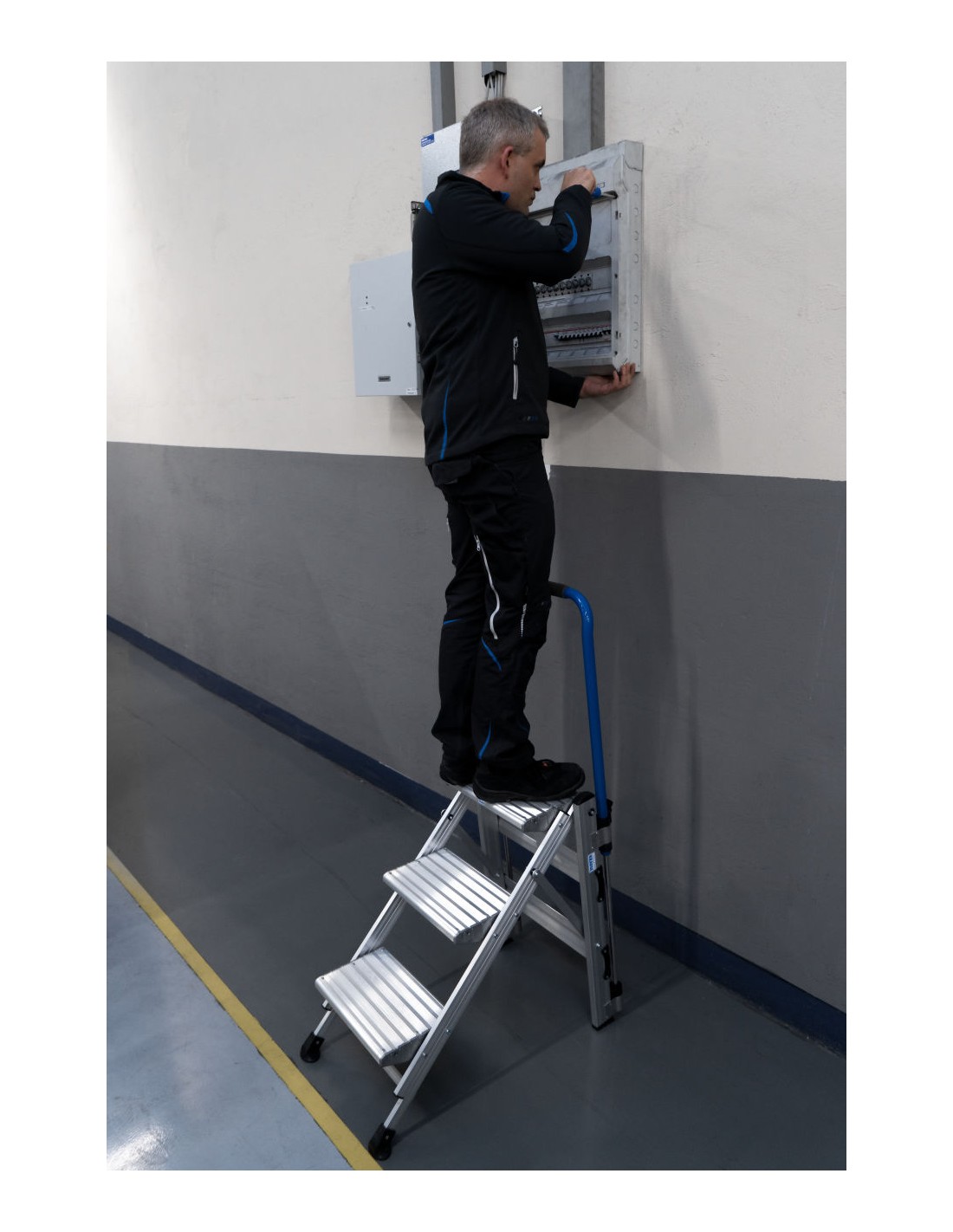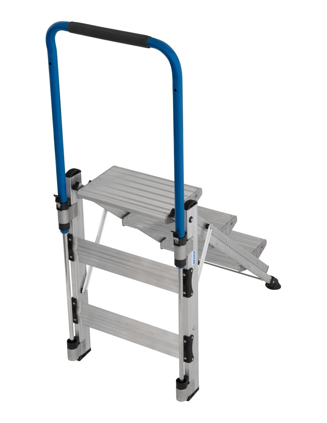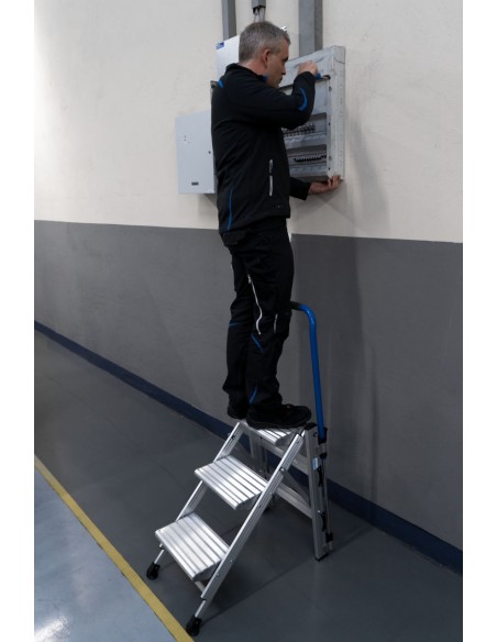 A robusztus, összecsukható alumínium lépcső bordázott fokokkal a legkülönfélébb feladatokhoz biztosít biztonságos fel- és lelépést, valamint kényelmes, laza tartásban történő munkavégzést.