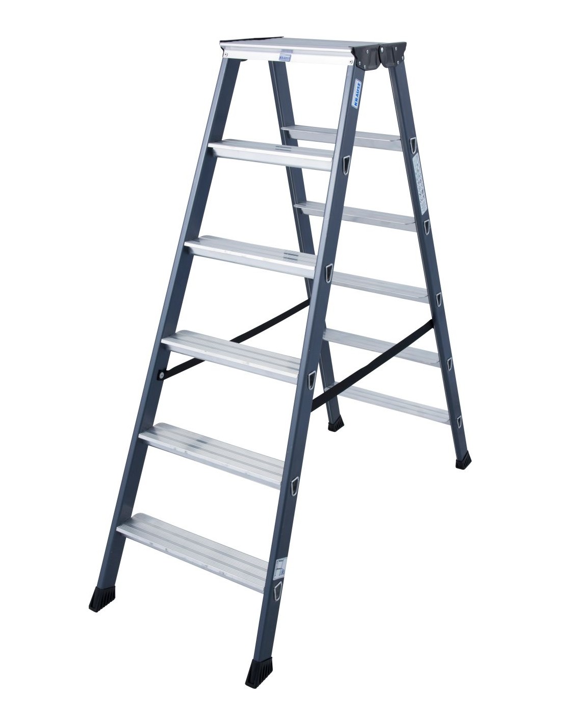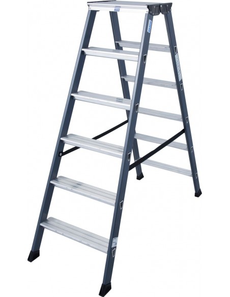 Ennél az alumínium állólétránál a peremezett fokok és az eloxált szárak révén a hosszú élettartam és a tisztaság áll a középpontban.